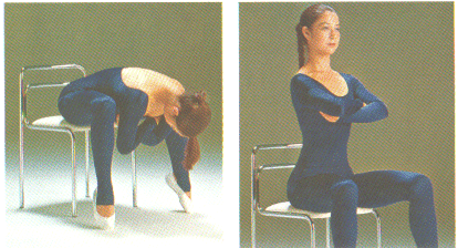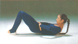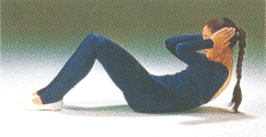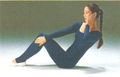 | ねじり 身体をゆっくりねじり、手を反対側の ひざにさわるように起きあがる。 | 両足かかえ 股をやや開きながら両膝をかかえ、膝を できるだけ脇の下につくようにする。 |